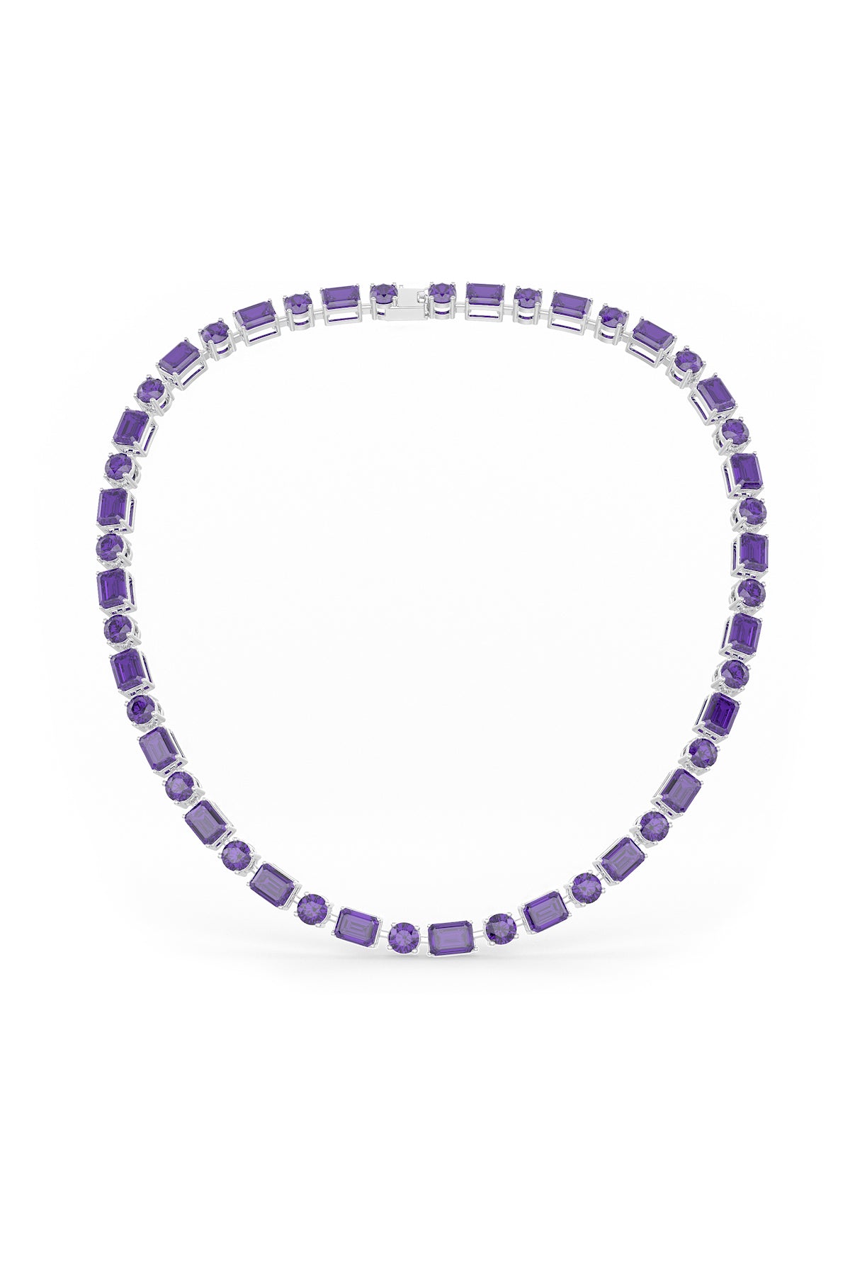 Immerse yourself in the radiant brilliance of the Amethyst Aurora Necklace, a masterpiece from the Kaleidoscope Collection. Featuring a harmonious blend of emerald-cut and round-cut deep violet hued CZ stones stones, this solitaire string design exudes timeless elegance and modern charm. Perfect for illuminating your special moments, this necklace is a celebration of color, craftsmanship, and unforgettable beauty.