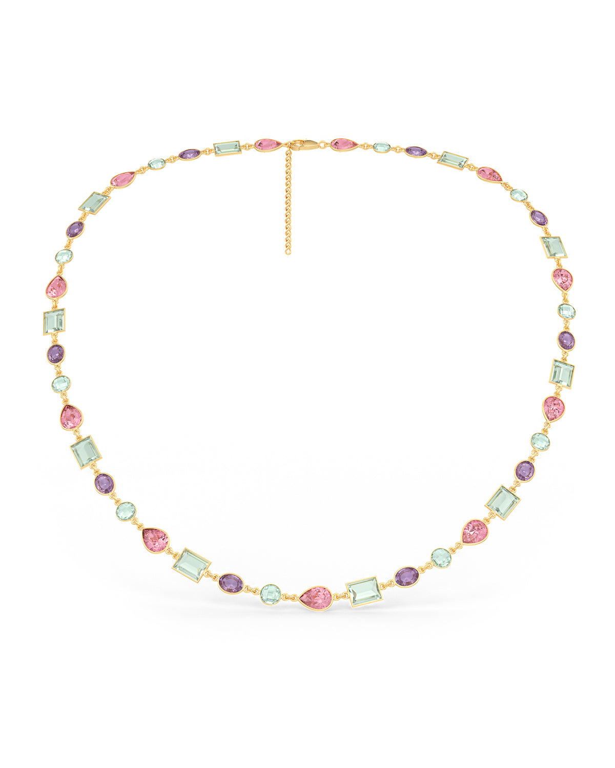 As soft and luminous as a coastal breeze, the Azure Whisper Necklace captures the dreamy hues of a Mediterranean summer. Crafted in sterling silver with 1 micron 18K gold plating, pastel tourmalines and amethysts dance across delicate links, evoking the endless skies and sparkling waters of Santorini. Light enough for a sun-drenched afternoon, yet refined enough for evening soirées, it’s the perfect companion for flowing linen dresses, sun-kissed skin, and endless adventures.